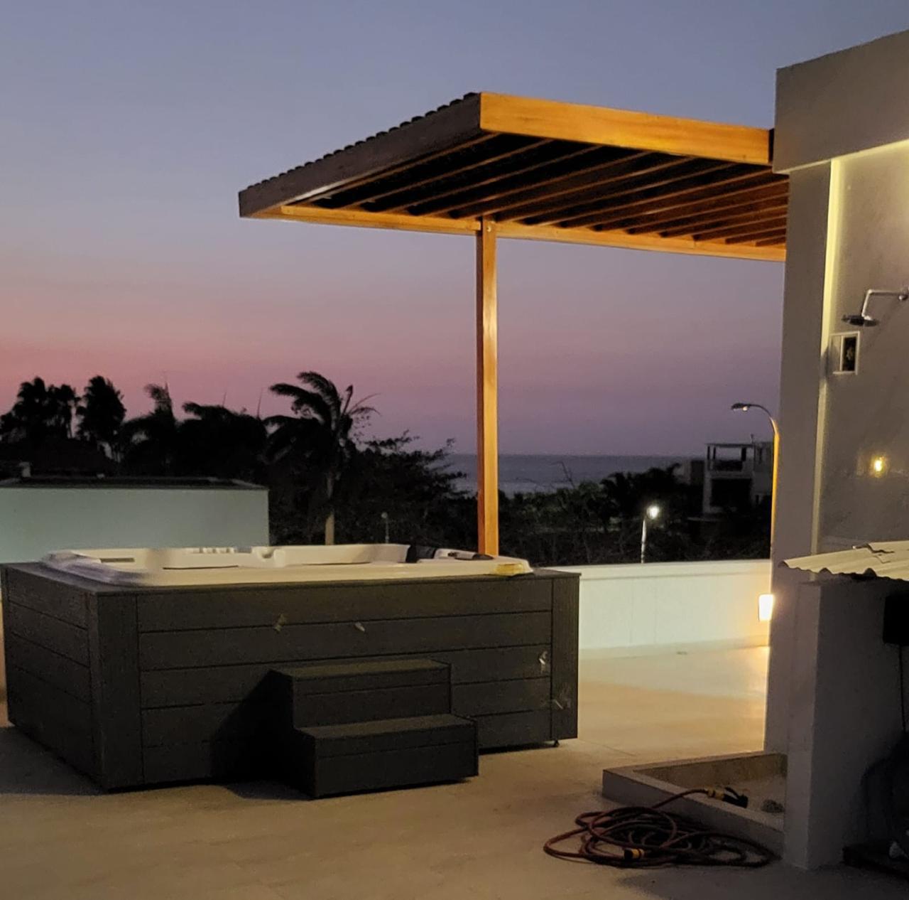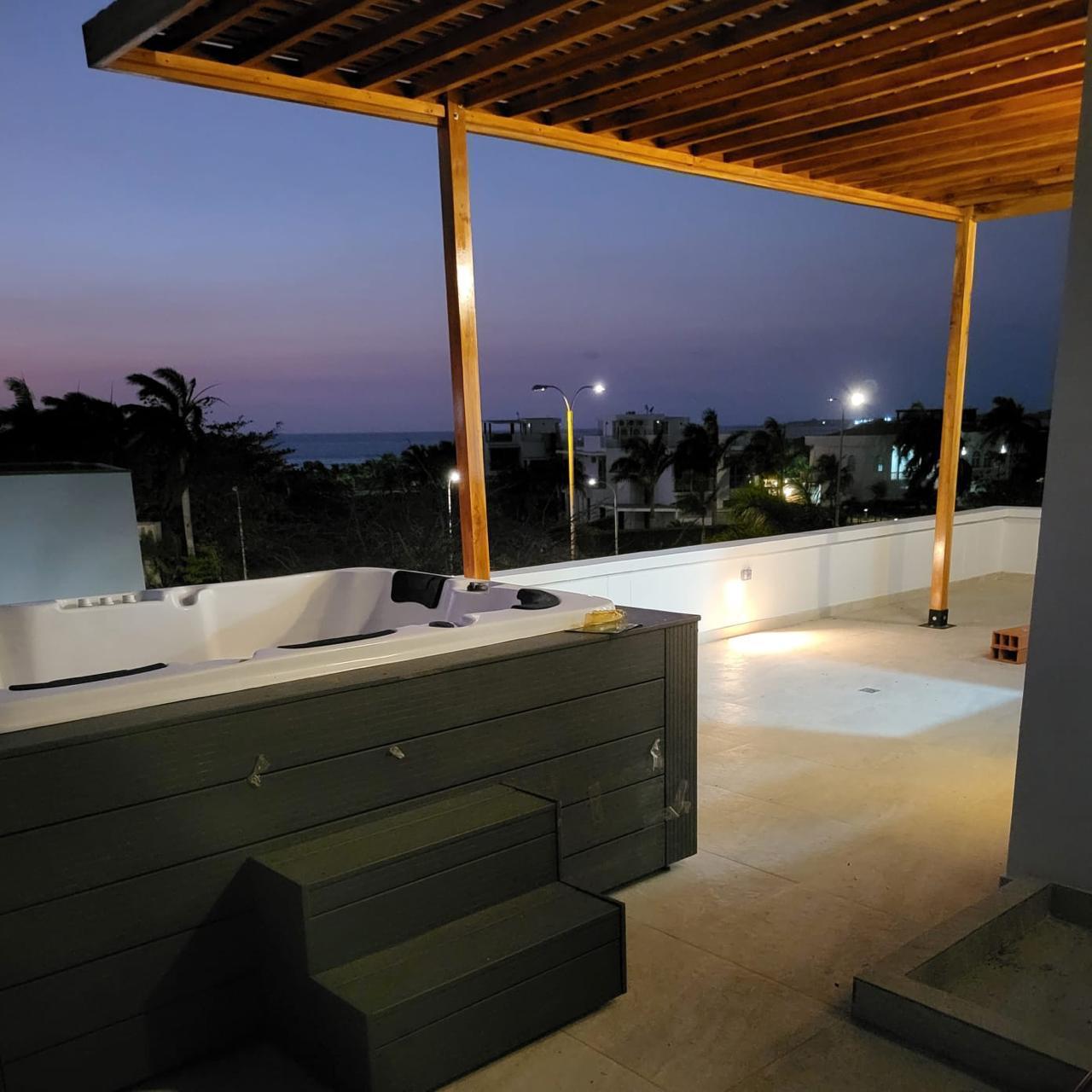 Baños: 5 + baño de servicio + 2 medios baños | Distribución Interna: Cocina abierta, zona de labores, sala comedor, hall de TV, baño turco y jacuzzi en 3er piso con vista al mar | Servicios Adicionales: Planta eléctrica 100%, reserva de agua 2.000 litros, parqueadero para 7 vehículos, bodega de 40 m²